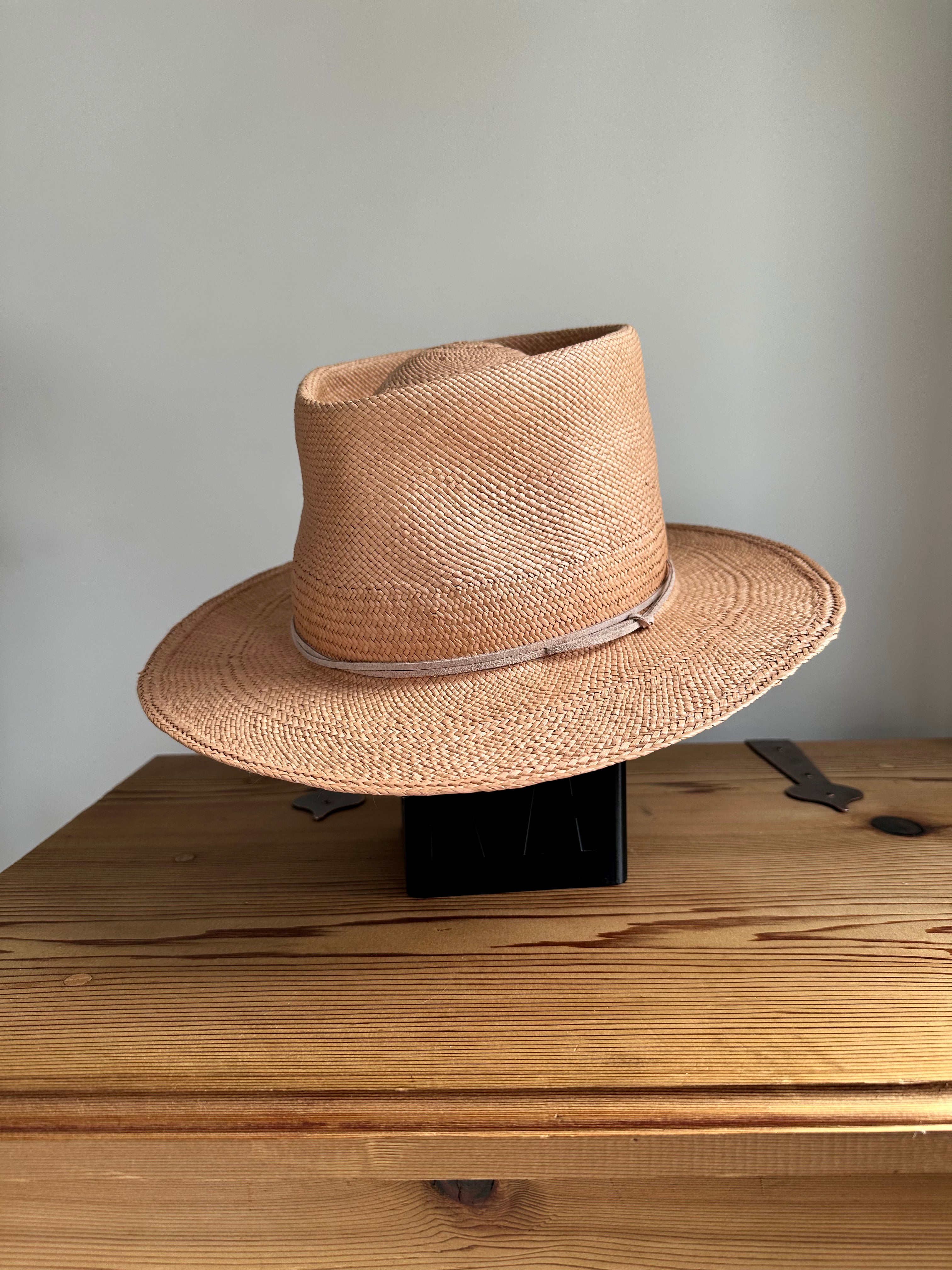 Handwoven toquilla straw hats in assorted colours and sizes. The hat bodies are individually made by hand in Ecuador using the leaves from the Toquilla palm. These straw hats provide up to 50+ UV protection. We hand shape each crown by hand in our studio and each hat has either a natural flat brim, a more rigid hemmed brim, or a reinforced raw brim.