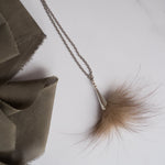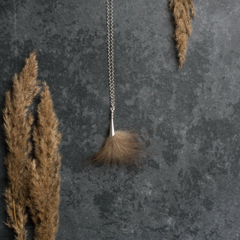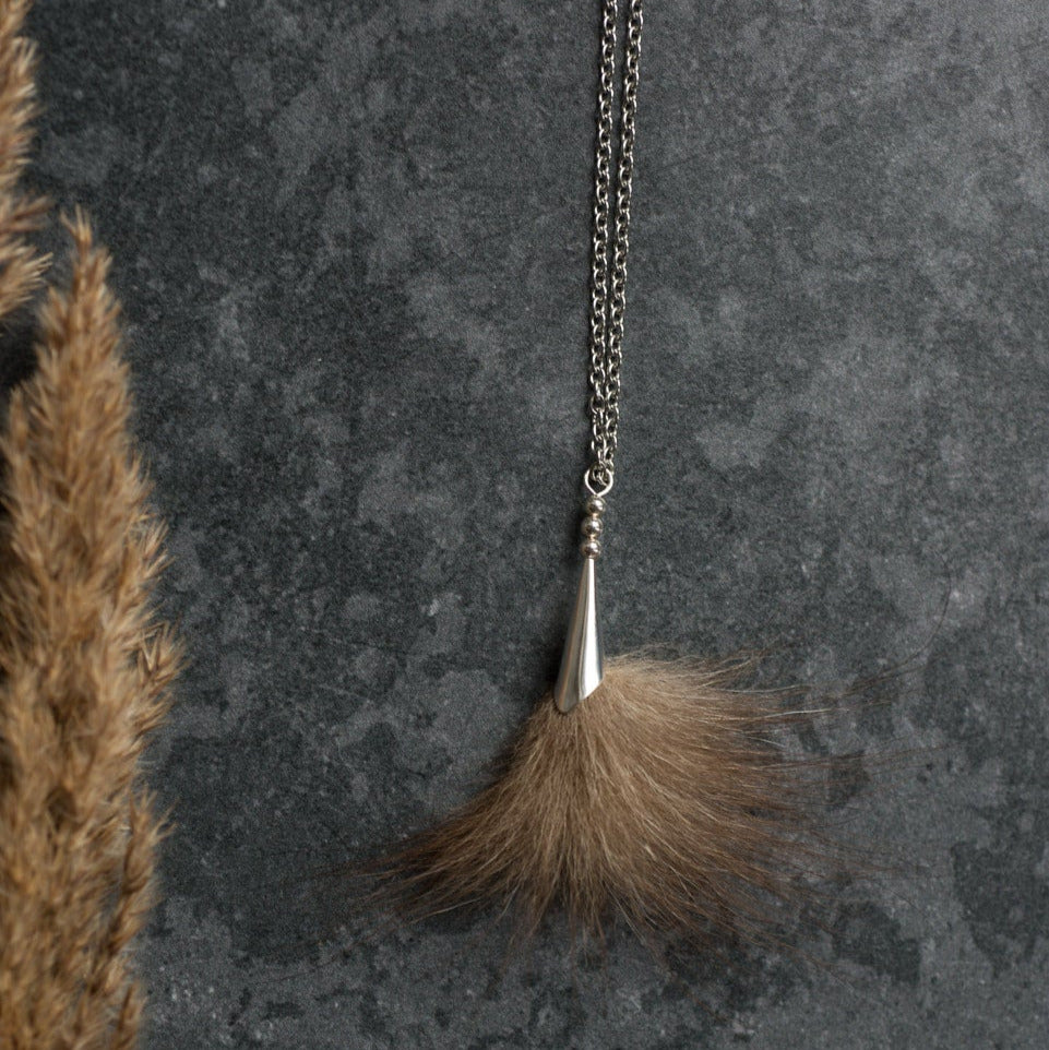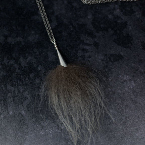 The companion necklace to the silver pom earrings, this addition to our Legacy Copper Cone collection has been requested for years. A hand stitched wolf fur pom is nestled into a glossy silver cone which is topped with three 3mm beads.